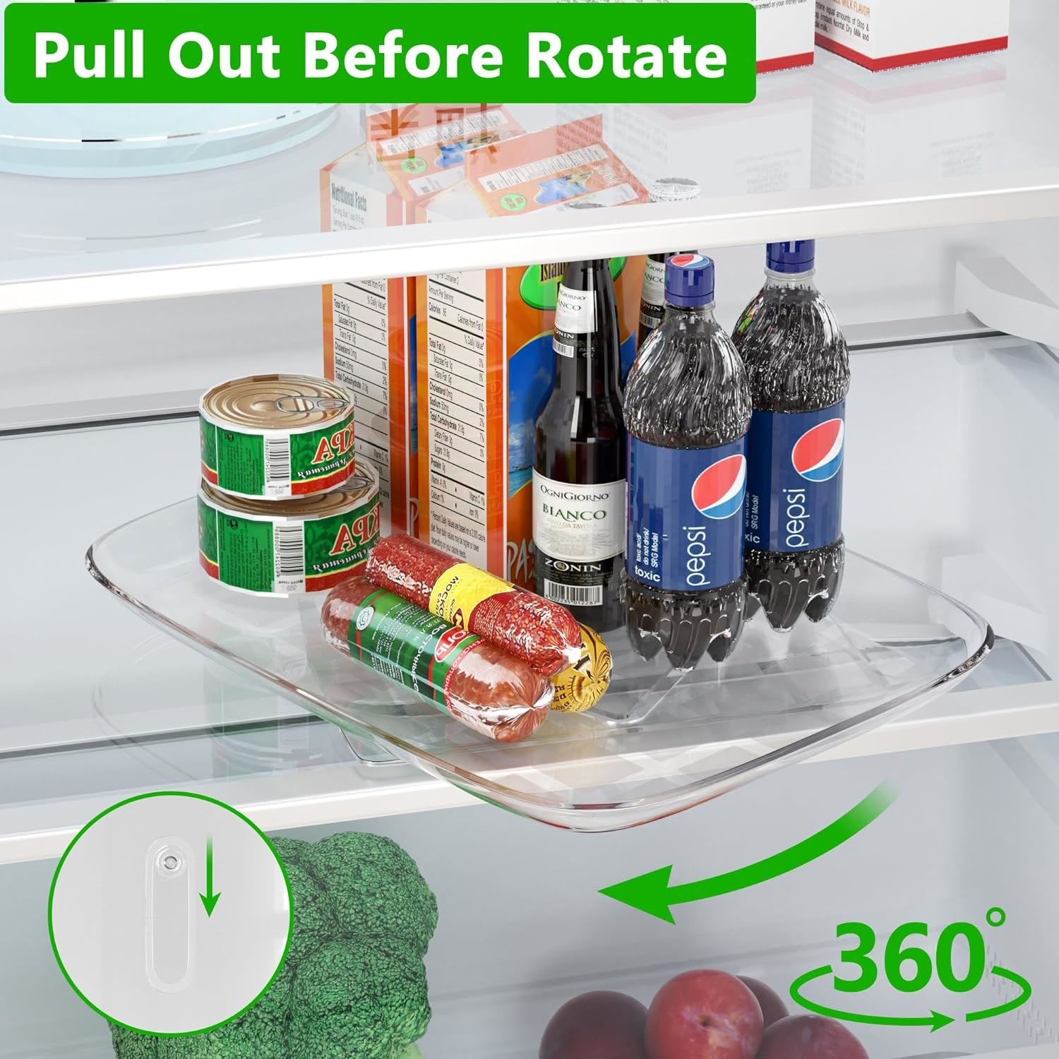 1.2 Pack The one for lazy susan turntable for refrigerator with a sliding mechanism that allows for switching between "lock" and "rotate". Slide out and rotate 360°, locked into a normal tray when not in use to prevent children from playing with it, causing messes.