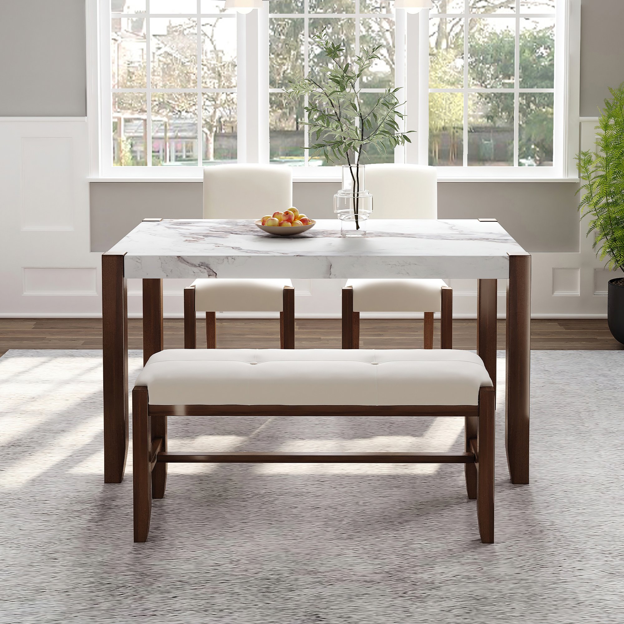 > 4-Piece Modern Dining Furniture Set, 4-Person Space-Saving Dinette for Kitchen, 46" Faux Marble Style Table and 2 Upholstered Chairs & Bench with Wood