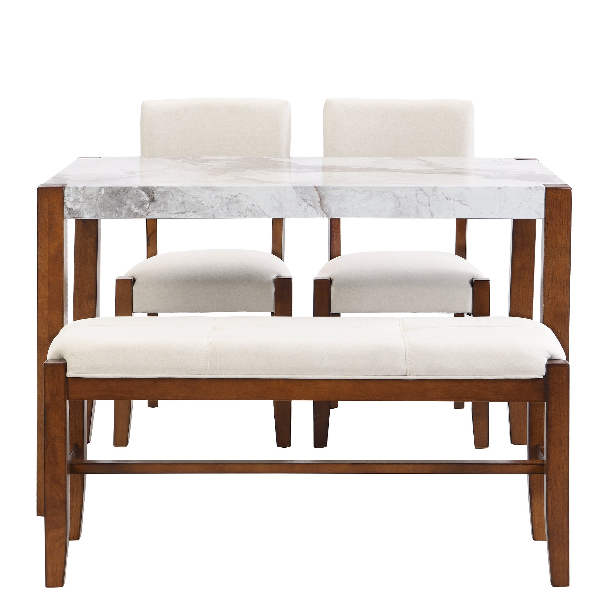 4-Piece Modern Dining Furniture Set, 4-Person Space-Saving Dinette for Kitchen, 46" Faux Marble Style Table and 2 Upholstered Chairs & Bench with Wood