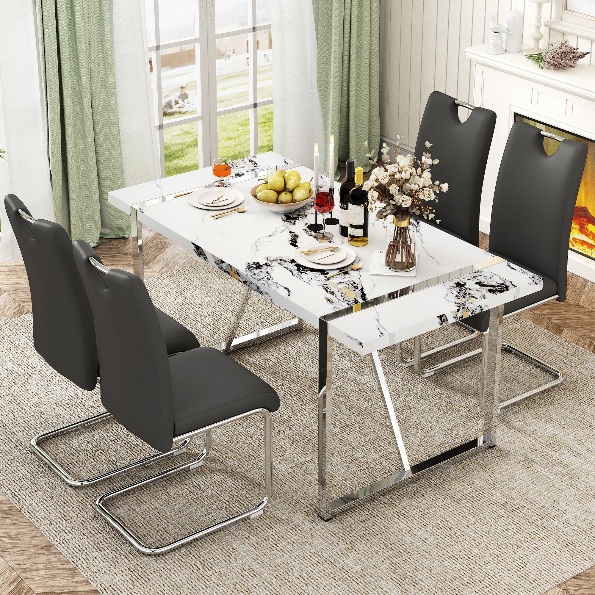 Are you looking for a dining table set? If so, this 1.57" Thick MDF Faux marble dining table set with 4 pieces chairs is highly recommended to you. Whether you want to enjoy dinner with your family at the dining table or gather with friends, this table will satisfy you. Great for the dining room, kitchen and living room, anywhere you want to put it.