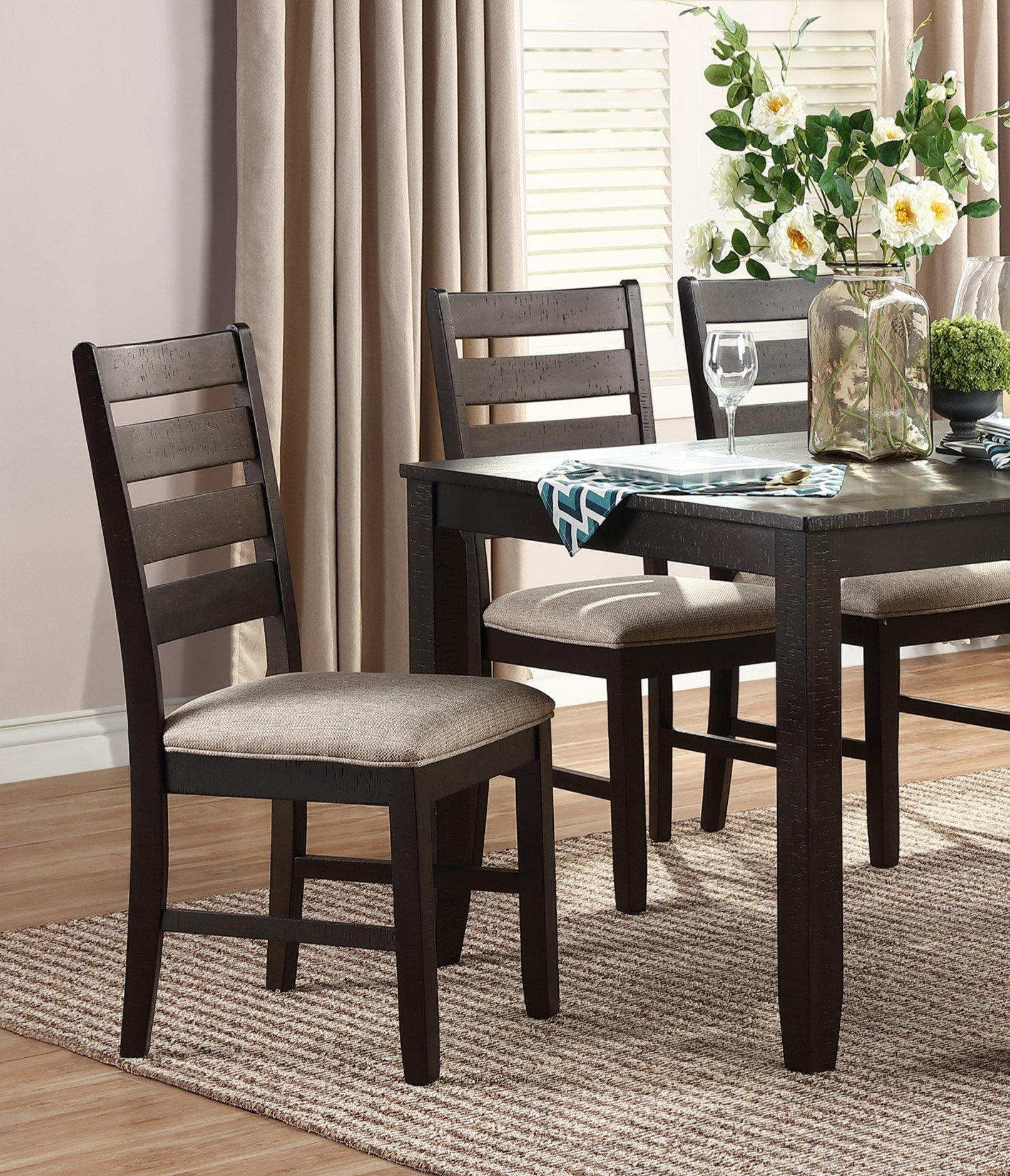 7pc Dining Set Brown Finish Table and 6 Side Chairs Beige Upholstery Seat Ladder Back Wooden Kitchen Dining Furniture
