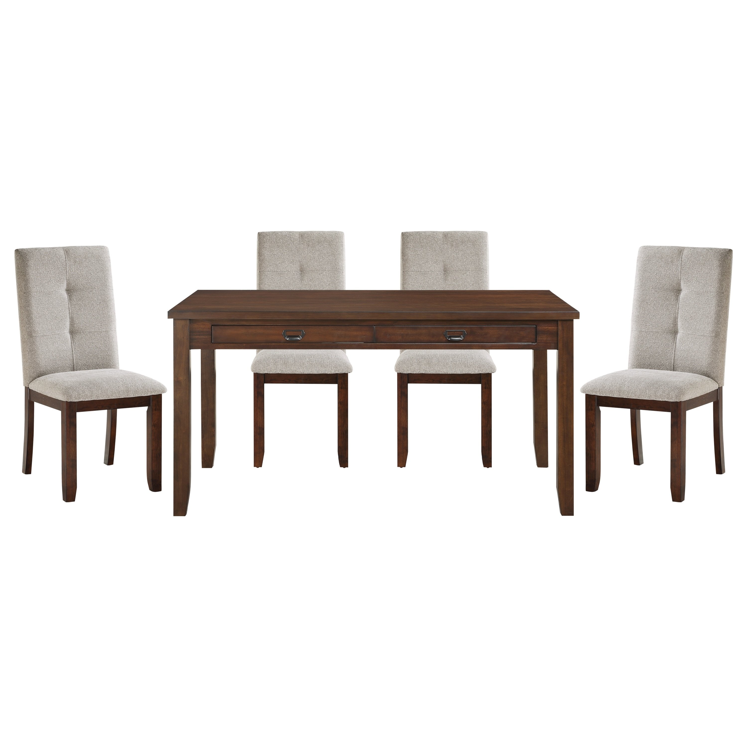 The transitionally styled table is uniquely accented by the modern lines of the accompanying chairs in the Binghampton Collection. Neutral tone fabric seats present complementing contrast to the cherry finish over cherry veneer of the casual dining group. Four functional drawers are located on the table apron allowing for convenient storage of tabletop accessories within quick reach. The available bench complements the design of the side chairs, providing an option for customizing your seating experience.PRODUCT DIMENSIONS: TABLE: 60" x 36" x 30"HApron to floor: 24.5"Distance between legs from the shorter side: 29.5Distance between legs from the longer side: 53.5"Drawer interior: 21.5" x 11" x 2" (4)CHAIR: 17.5" x 24.5" x 38.5"HSeat Width: 17.5"Seat Depth: 17"Seat Height: 19"Listing Includes: 5pc Dining Set (1 Table and 4 Chairs) Only.Bench: Not included.Simple Assembly Require