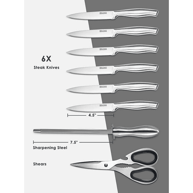 Includes 8" chef knife, 8" carving knife, 8" bread knife, 7.5" stainless sharpening steel, shears, 4.5" utility knife, 4.5" steak knife * 6 piece, 3' paring knife, 6' sandwich knife, 5.5' cheese knife, 3.5' pizza knife, acrylic block.