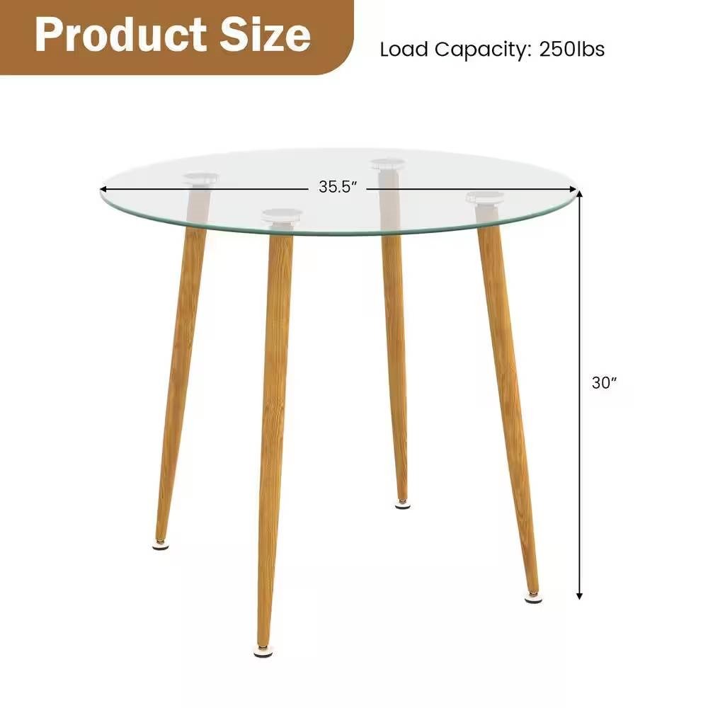 This Modern 35.5-inch Round Glass Top Dining Table with Wood-Look Metal Legs makes your dining space more stylish and comfortable. Supported by 4-metal legs, the 0.3 in. thick tempered glass tabletop can withstand a great weight of 250 lbs. Also, its smooth surface is water resistant, definitely making cleaning easier. At the bottom, there are adjustable pads supplied to keep the whole glass dining table balanced. Measuring of 35.5 in. x 35.5 in. x 30 in. (L x W x H) the circle kitchen table can fit into a small space and seat 2-4 people. No need to worry about the decoration style, the glass table is modern and able to blend well into diverse home finishes. Moreover, its assembly is pretty simple.
