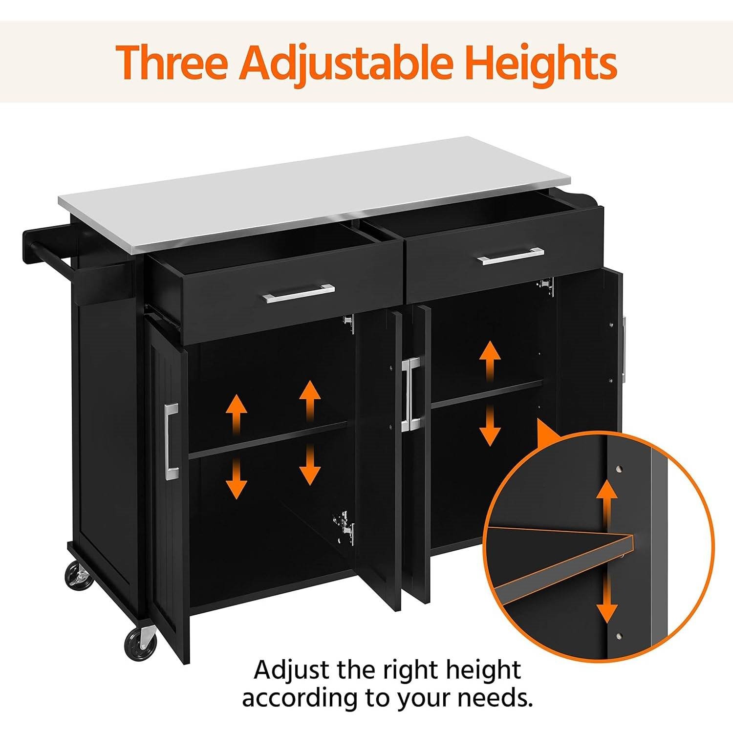 Black Kitchen Island Cart with Stainless Steel Top 2 Drawers and Cabinet