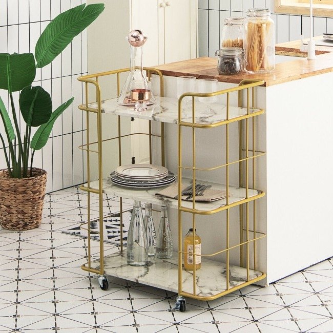 3 Tier Faux Marble Gold Rolling Bar Cart