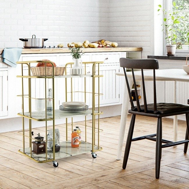 This 3 Tier Faux Marble Gold Rolling Bar Cart offers sufficient storage for food, wine, beverage, tableware and so on, which can well satisfy your storage needs. It's designed with beautiful gold frame and faux marble finish, which brings a touch of elegance to any room of your house. The kitchen utility cart is equipped with four 360° swiveling casters for smooth rolling, including two casters with brakes. Made of rust-resistant steel and high-quality MDF, the serving cart is solid and durable. Each shelf can bear a weight up to 55 lbs.